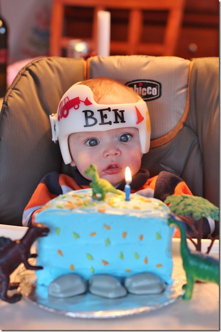 To begin, “Plagiocephaly” is simply a common condition of a misshapen head in many infants, caused by the fact that their skull is still so soft. They have noticed an increase in this condition since parents were instructed to put their babies on their backs to sleep, which has drastically reduced the risk of SIDS. There are different types of plagiocephaly, but Ben’s is categorized as “severe” (according to his specialist), due to the fact that it began in utero (probably due to the gestational diabetes, and his size in relation to mine…), and his skull bone formed that way as it was being pushed against one of my bones. Therefore, it will take a little more work, from an external source (a helmet), to correct the problem. Even though he doesn’t have many of the traditional “flat spots” that many babies exhibit, he has “bossing” ( or a bump) on his forehead and has a slanted parallelogram shape to his head. Since half of his head is being pushed forward, his facial features are beginning to become more asymmetric.